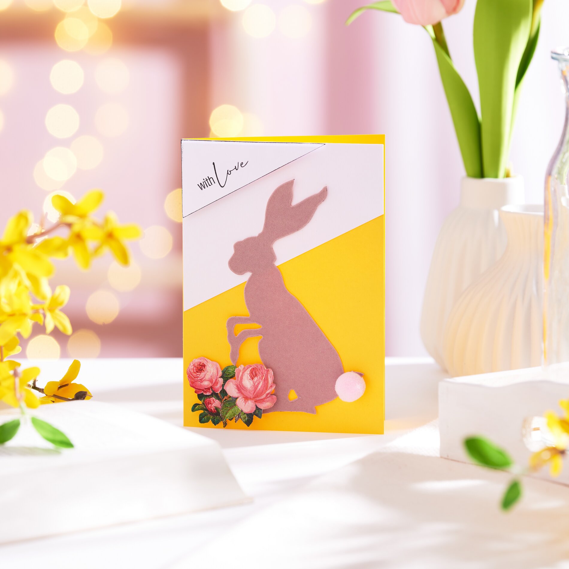 Send velvety Easter greetings this year. Use a punching template and velvet paper to create Mr. Rabbit, the star of the card. In our example, we decorate the card with pompoms, glue pads and glossy images for a great 3D effect.