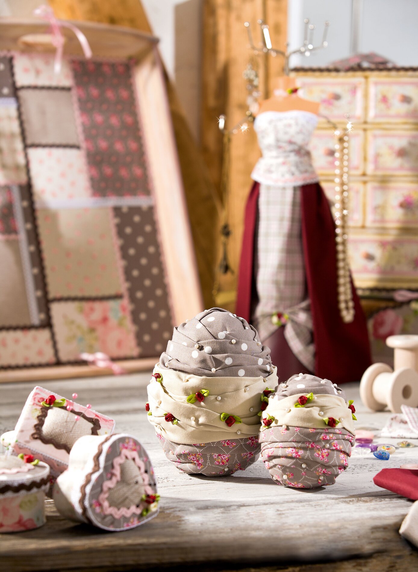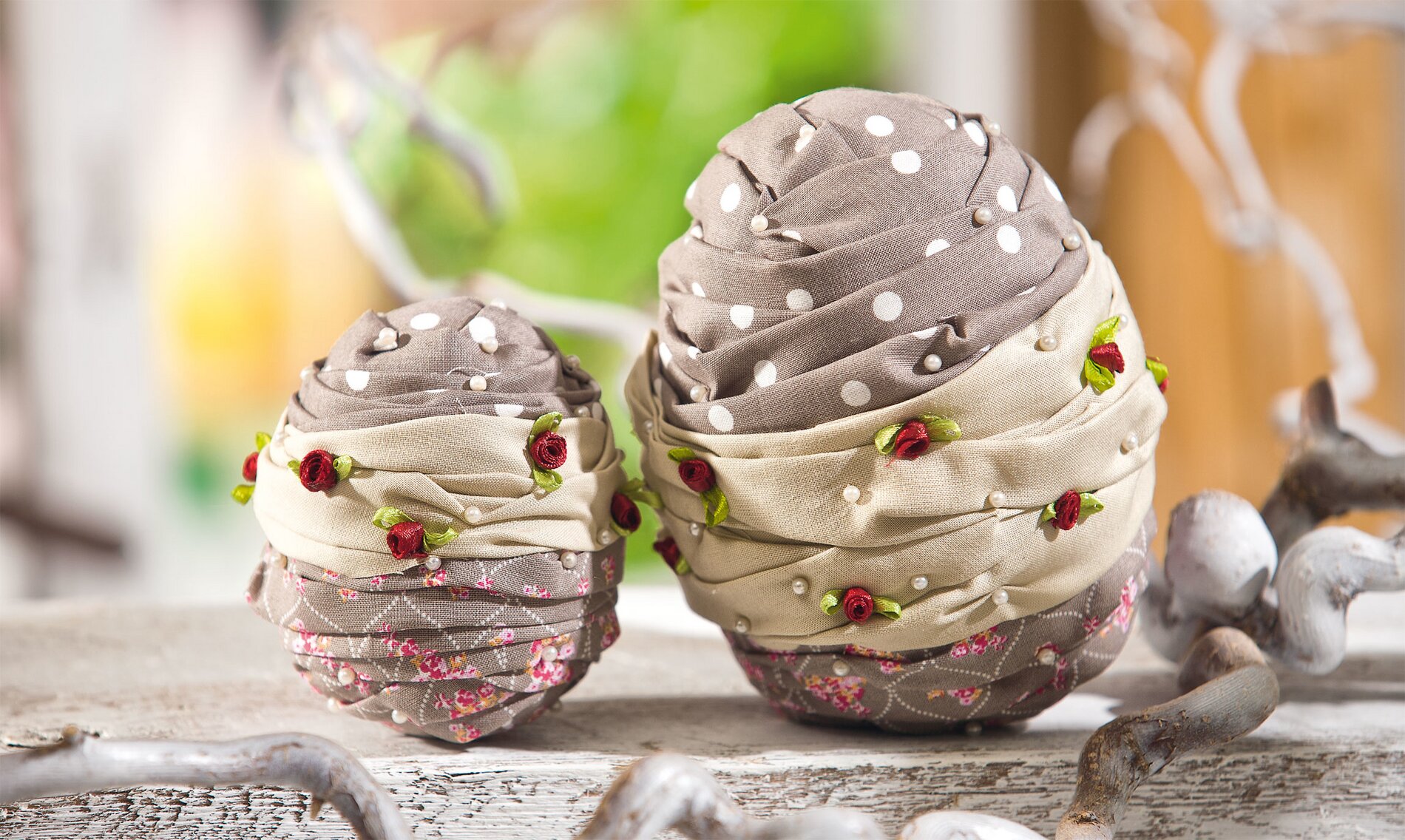 With a few simple steps you can transform white Polystyrene-eggs into exclusive Easter decorations in country house style. The fabric strips are wrapped around the shapes at only and fixed with Pins - very simple and very effective.