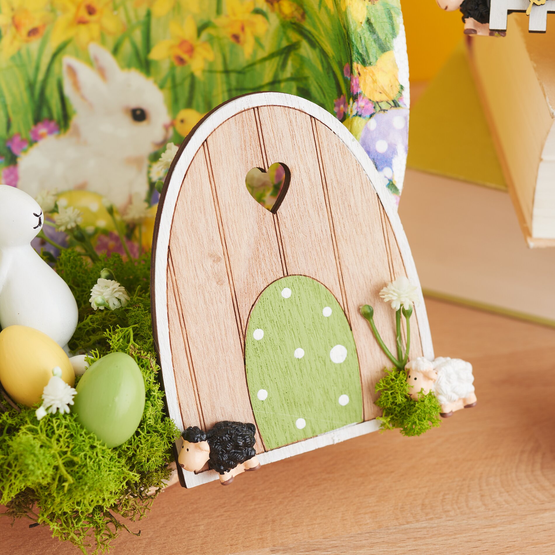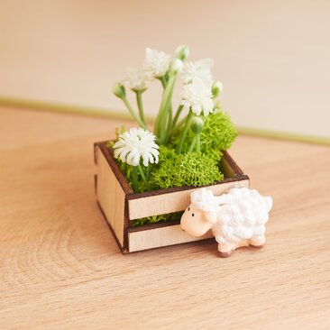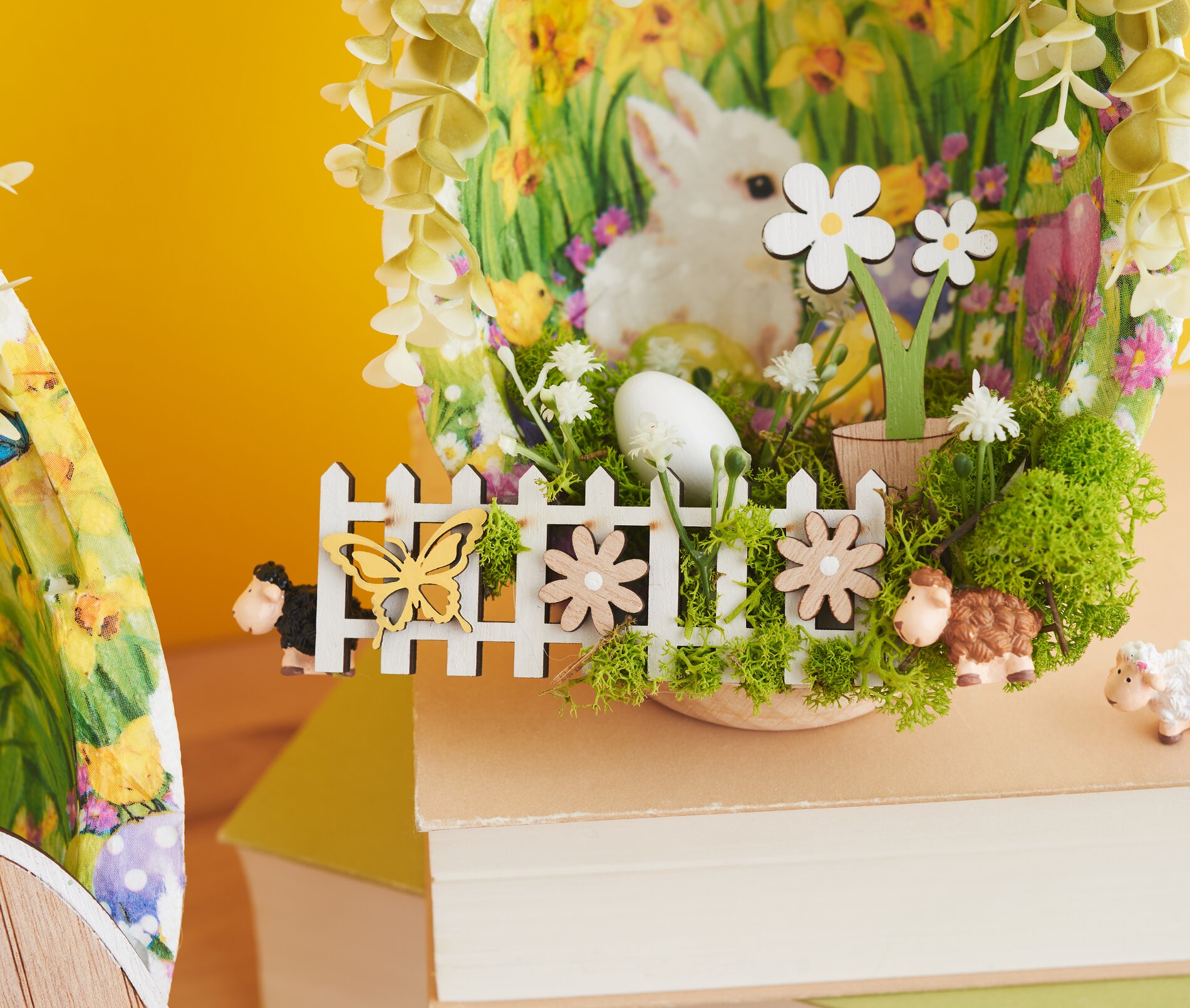 Once everything is dry, start designing your Easter miniature world. Arrange everything according to your personal taste and use hot glue to attach moss, miniatures or artificial plants to the polystyrene to give it a finishing touch.