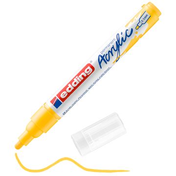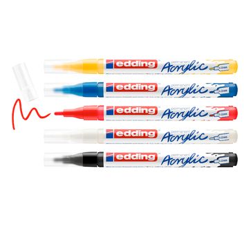 A great set of 5 edding 5100 "Acrylic Markers - Basic", medium, with a line width of approx. 2-3 mm. These versatile acrylic markers are all-rounders and have a medium bullet tip. The round tip allows you to colour in smaller areas, write or even paint contours. The ideal pens for acrylic painting on canvas and paper. This set contains the colours Traffic Yellow, Traffic Red, Gentian Blue, Yellow Green and Deep Black.