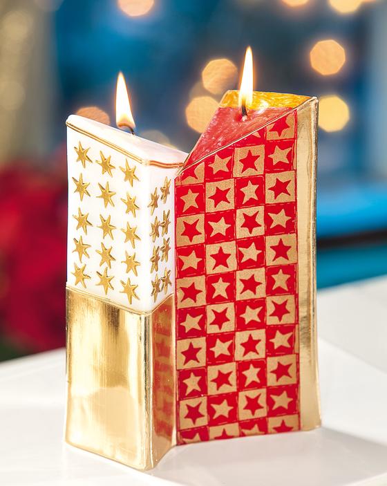 Personal candle design is easy and leads to unique candles. In these instructions decorative wax plates in shiny Gold and christmassy Red of the unusual shape of this design candle a high-quality appearance. The individual stars on the white surfaces fit perfectly.
