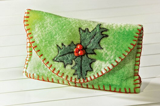 Now transfer the template for the ilex motif onto the flap with a line-ex pen. Place fine layers of fairy tale wool inside the motif and felt them onto the special mat until the motif is covered with felt. Finally, felt the contours with fine strands of black fairytale wool and a single needle and decorate the finished motif with wooden beads.