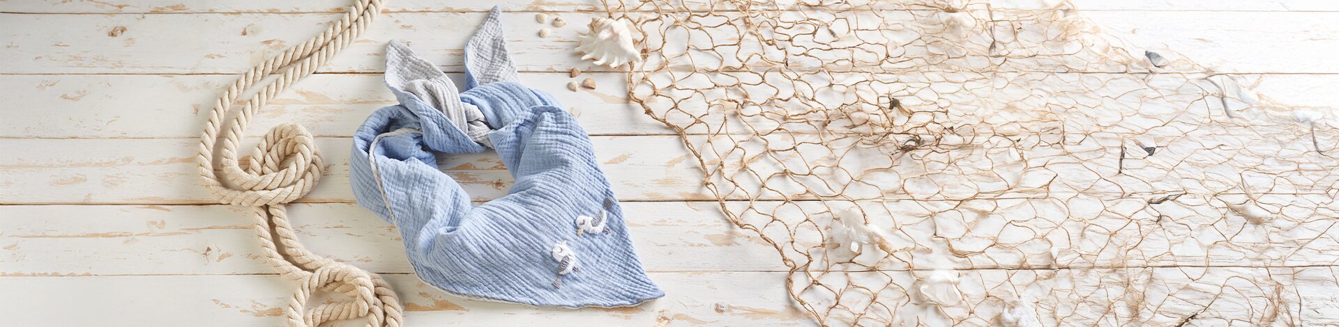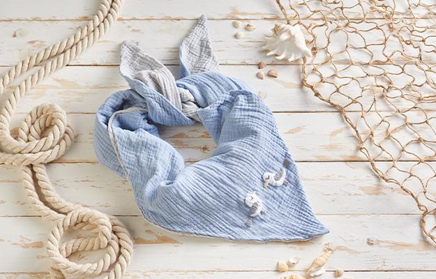 Crinkle muslin cotton fabric with hot-foil effect "Stripes", Light blue