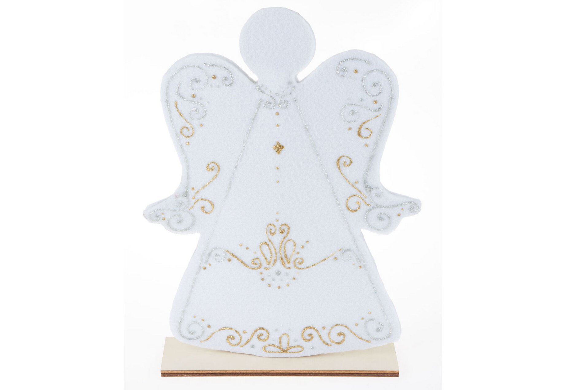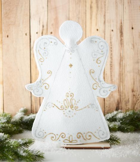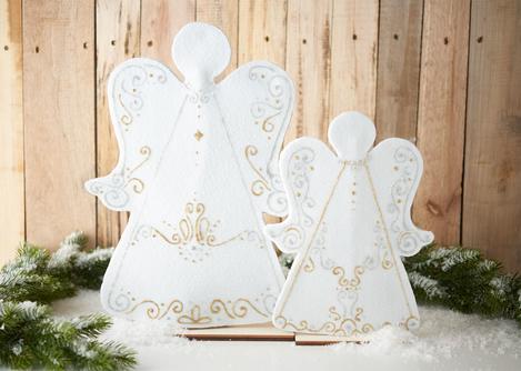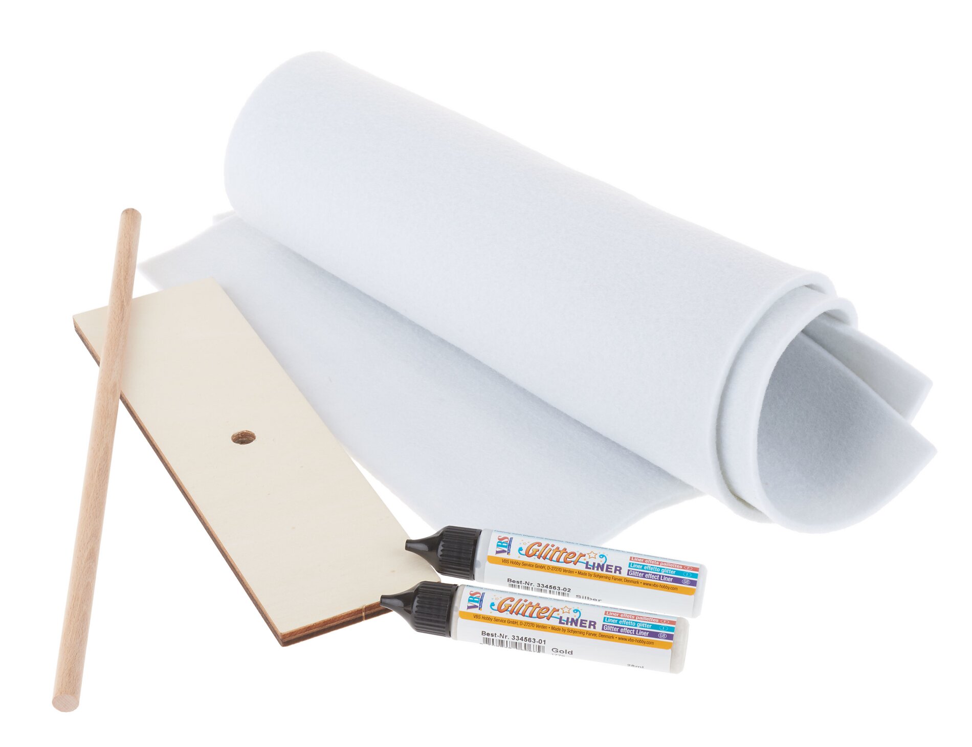 Copy the motif template and transfer the figure twice onto the white felt piece. Cut out both angel shapes and decorate them with the glitter liners with gold and silver outlines.