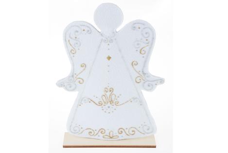 Glue both Engel parts together at the edges with Handicraft glue . Put the round stick into the wooden plate, fix it with glue and pull the felt angel onto this self made wooden stand.