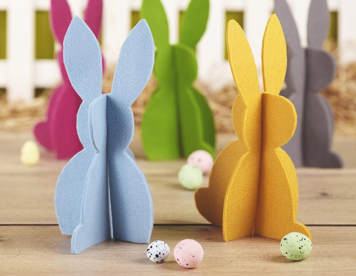Easter bunnies from Textile felt are very quickly made by yourself. Simply download the motif template, trace the contours of the bunny on Felt , cut out both bunny parts and put them into each other - done!
