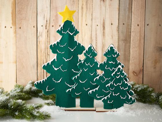 Paint the felt trees with white decorative snow. Glue all the felt pieces together to form a fir tree so that a felt cover is created. Put the wooden stand together (fix the joint with glue) and pull the felt tree over the stand.