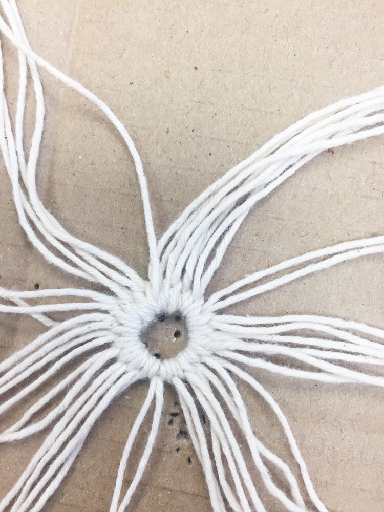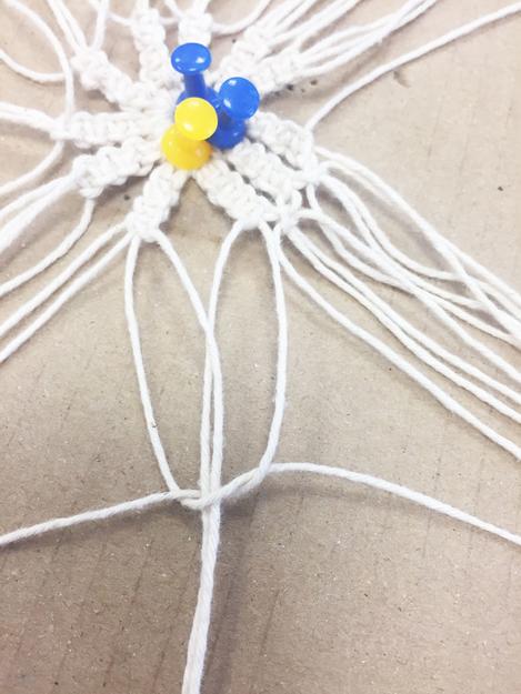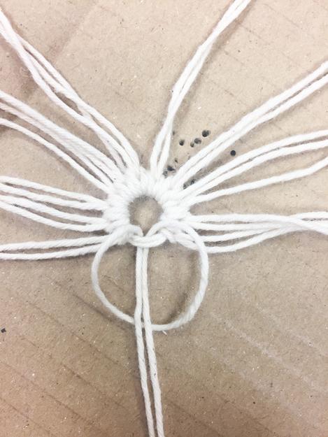 If you now spread out all the threads radially on your work surface, you will have 44 threads. In each case 4 threads are linked to weaver knots. Make each skein about 2 cm long.