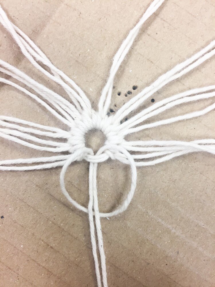 The Macramé-place mat was made with Warp yarn . First cut 22 Warp yarn threads of 1.5 m each. Tie a small ring from the first thread. Fold each thread in half and tie it to the ring at this height as loops