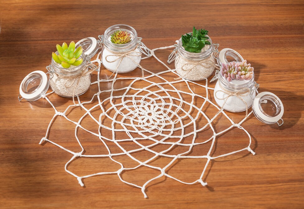 With Macramé you can make a great place mat from simple natural Yarn . It's fun to tie the knots and the selfmade doily harmonizes with the interior decoration.