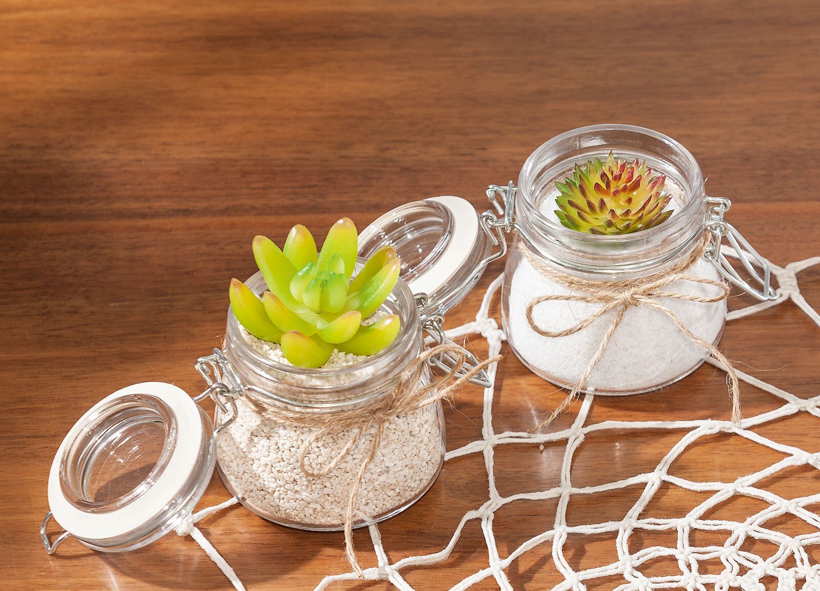With only little effort you can conjure up a contemporary decoration from simple storage jars in a short time. Simply fill the glasses with Decorative sand or gravel, insert artificial succulents, wrap a small Jute ribbon-loop around each glass - the decorative glasses are real eye-catchers, also ideal as gifts!