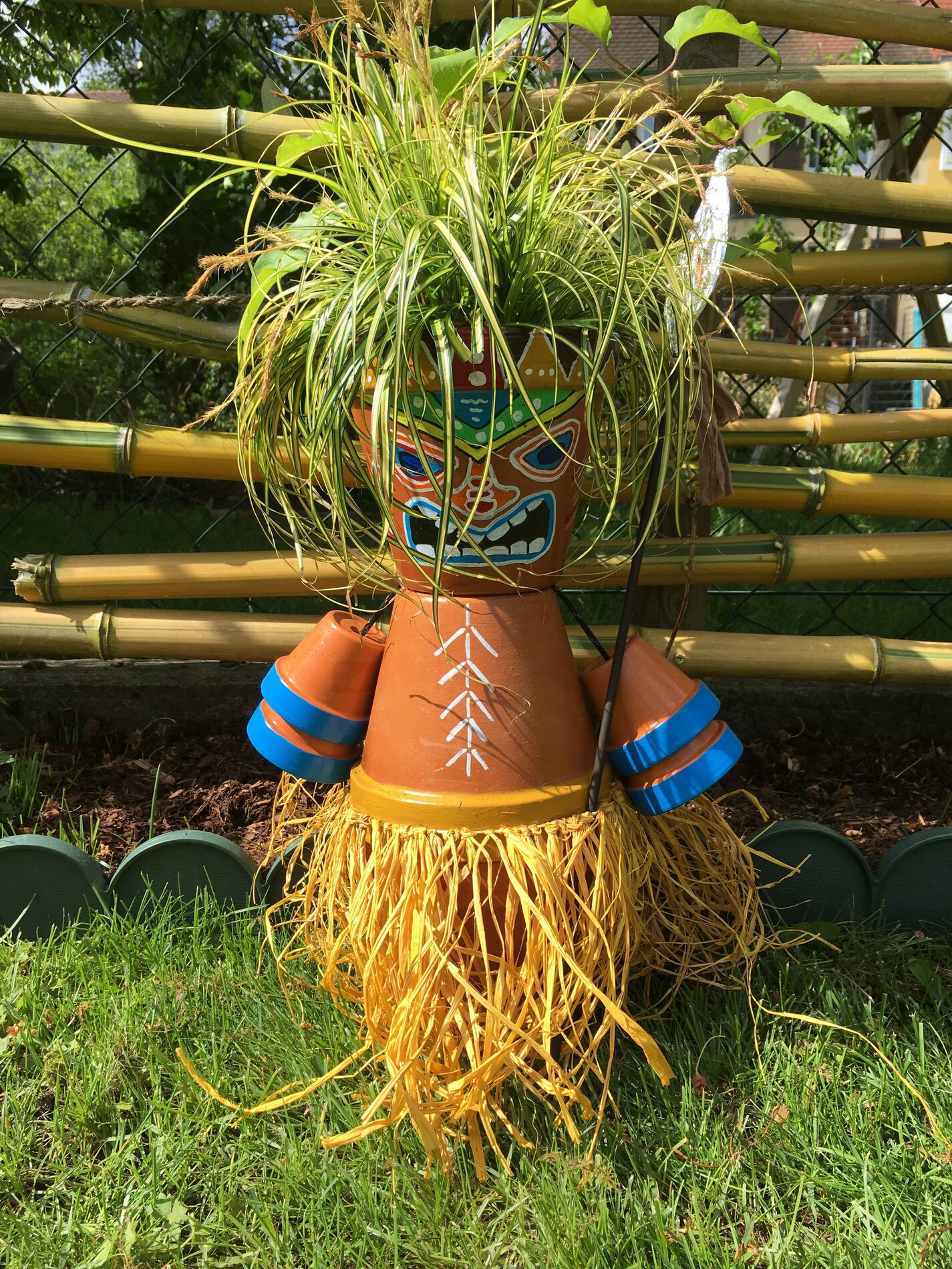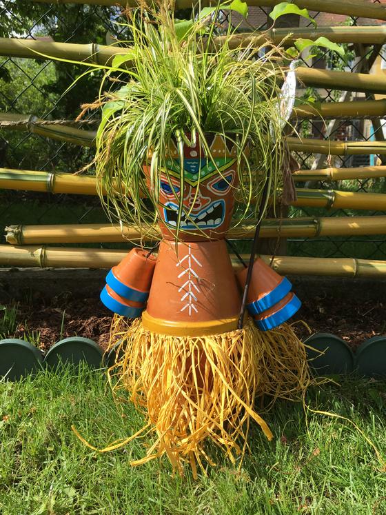 The figure consists of 3 large Terracotta pots, which are stacked after painting to a large body with head. From 2 small Terracotta-pots each, the arms are created.