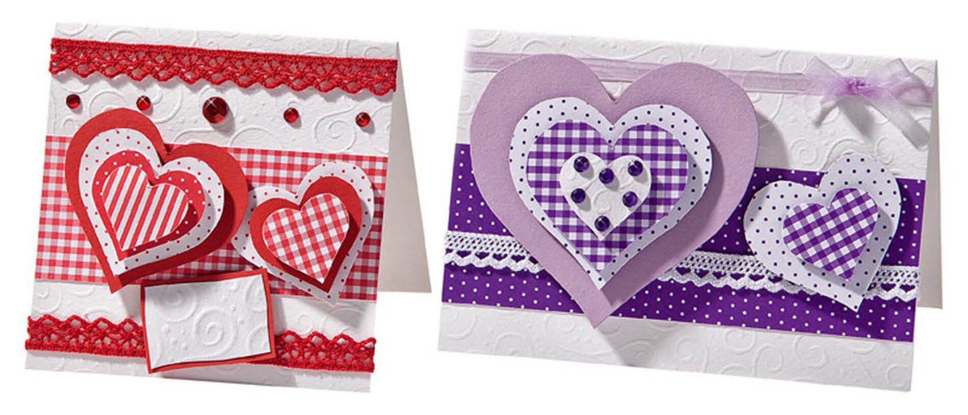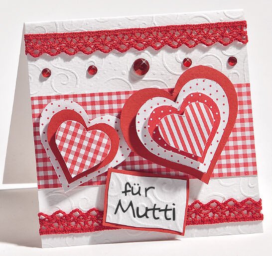 You can now glue other cardboard strips or ribbons and lace onto the front and back of the envelope. Next, you can use the template to cut out hearts in different sizes, stick them on top of each other with 3D adhesive pads and then attach them to the envelope. Finally, decorate the Mother's Day envelope according to your personal taste.