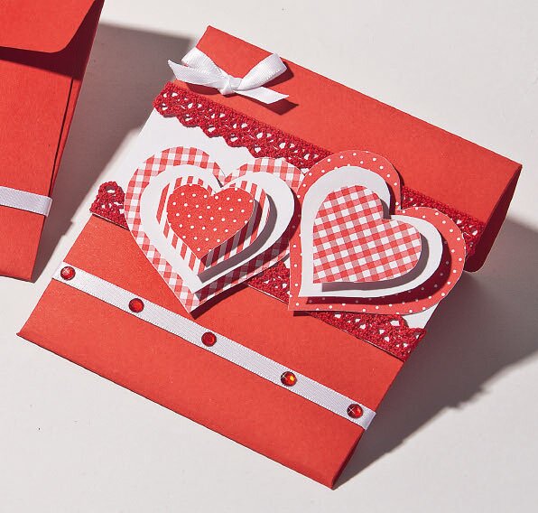 Transfer the smaller of the templates from the template set to red Craft cardboard sheet, Cut out the envelope and then glue it together. How to do this is described in detail in the instructions of the set.