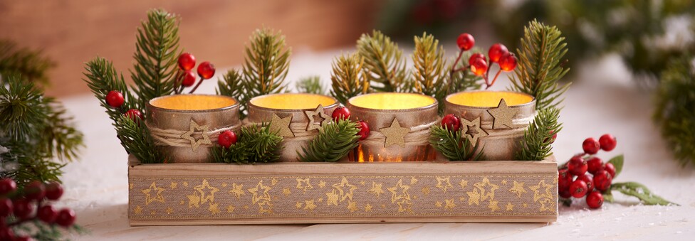 The glasses are each equipped with an LED tea light and are placed in the wooden box with fir branches and berries as decoration.