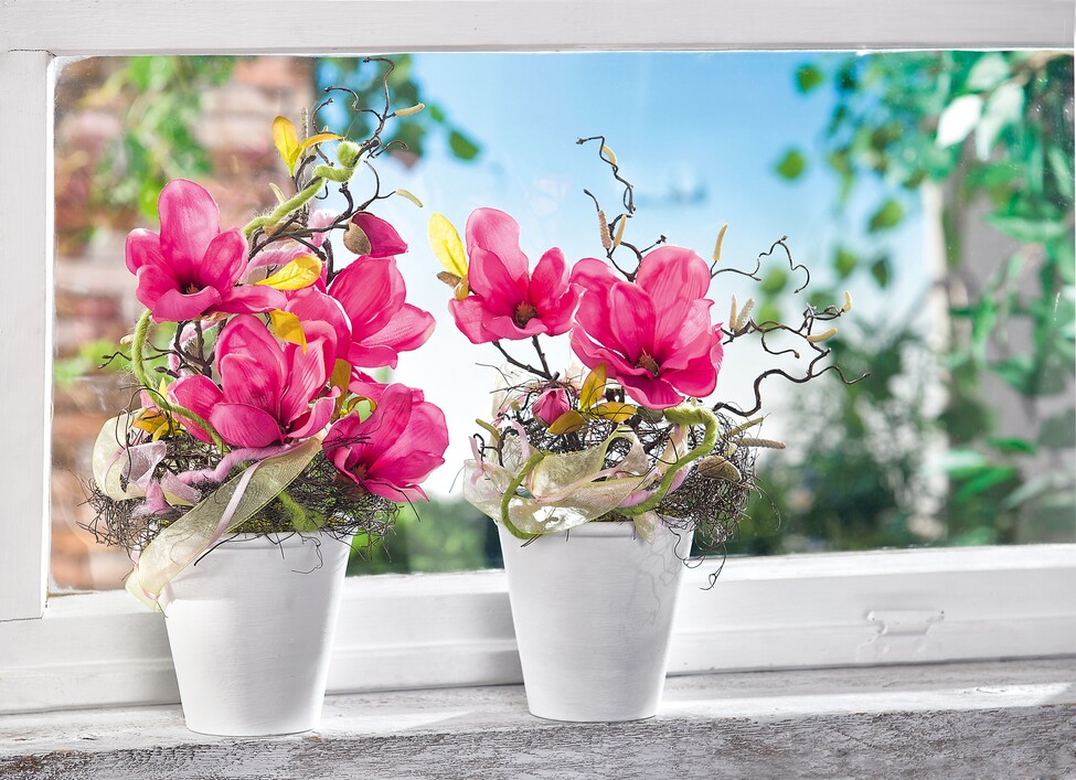 Cut magnolias and freshly cut willow catkin twigs from the garden to the desired length and place them in the pots in a stepped arrangement.