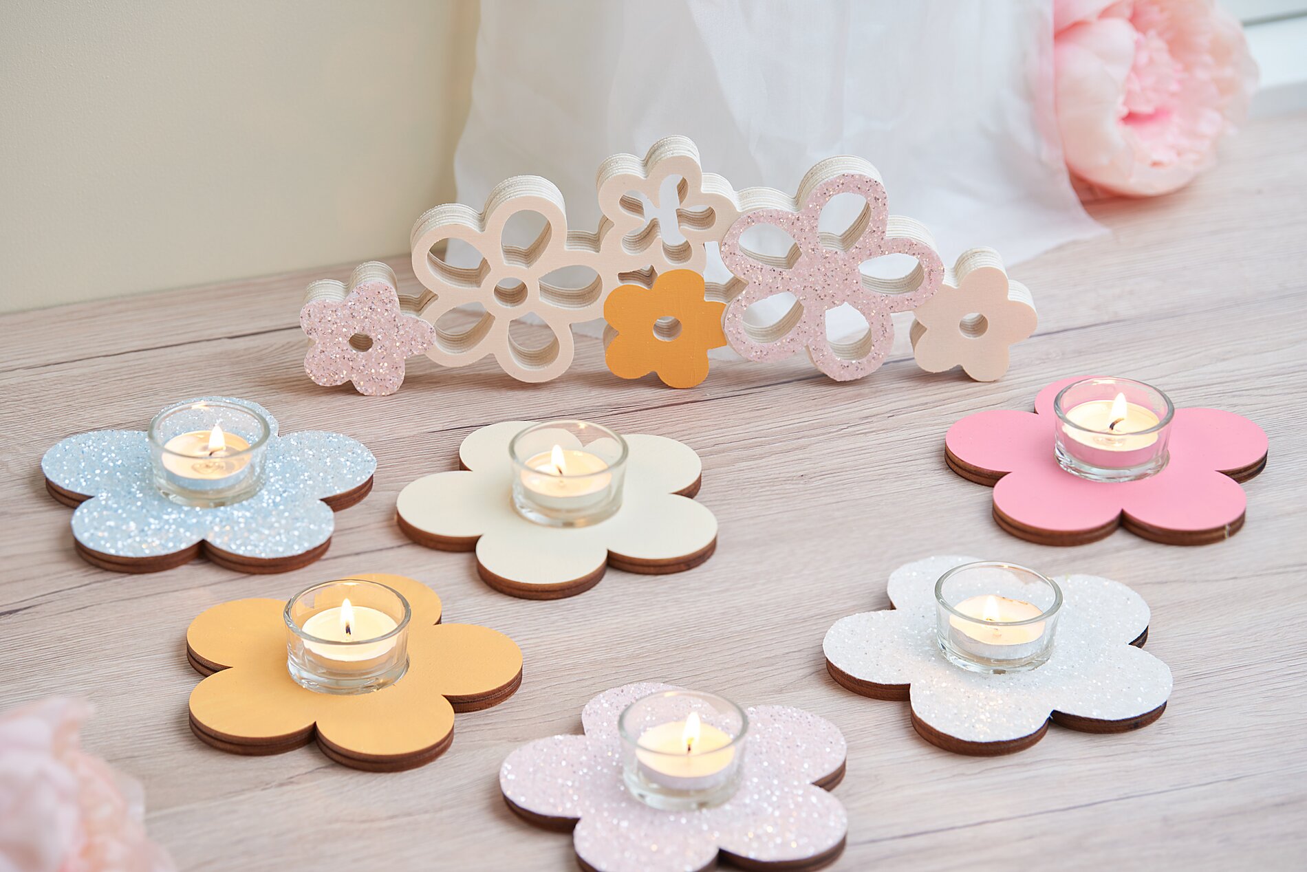 Paint the Tealight holders "flower" in different sunny colours: Yellow, Old Pink, Ivory, May green and Apricot.