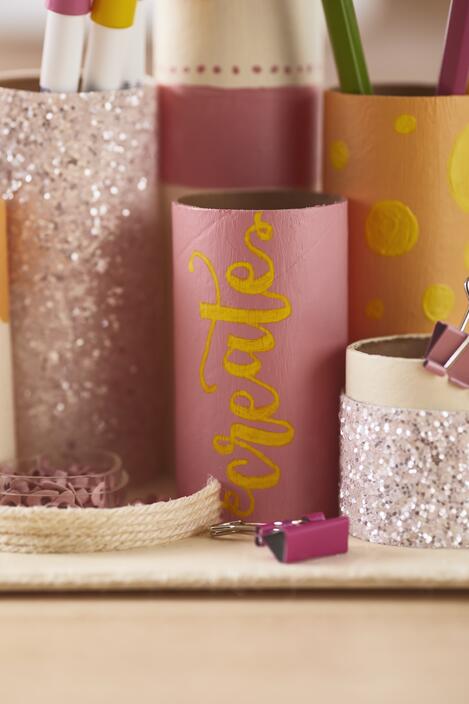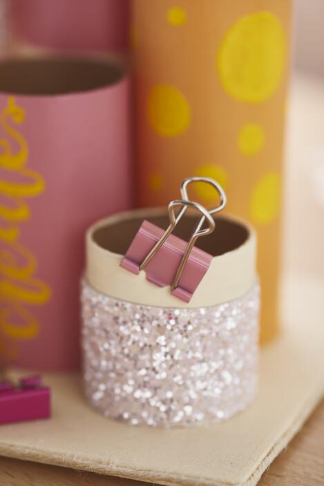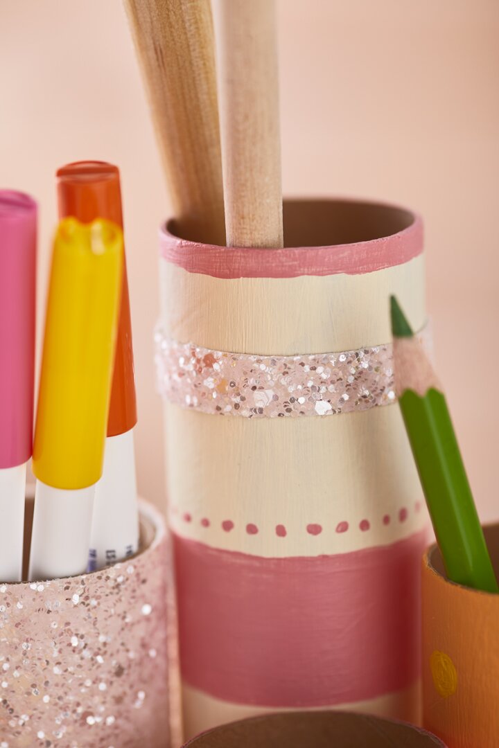 The cardboard rolls are now cut in different heights. In our decoration example we used 2 cardboard rolls with 10 cm, 7,5 cm height and 1 roll in 15 cm and 4 cm each