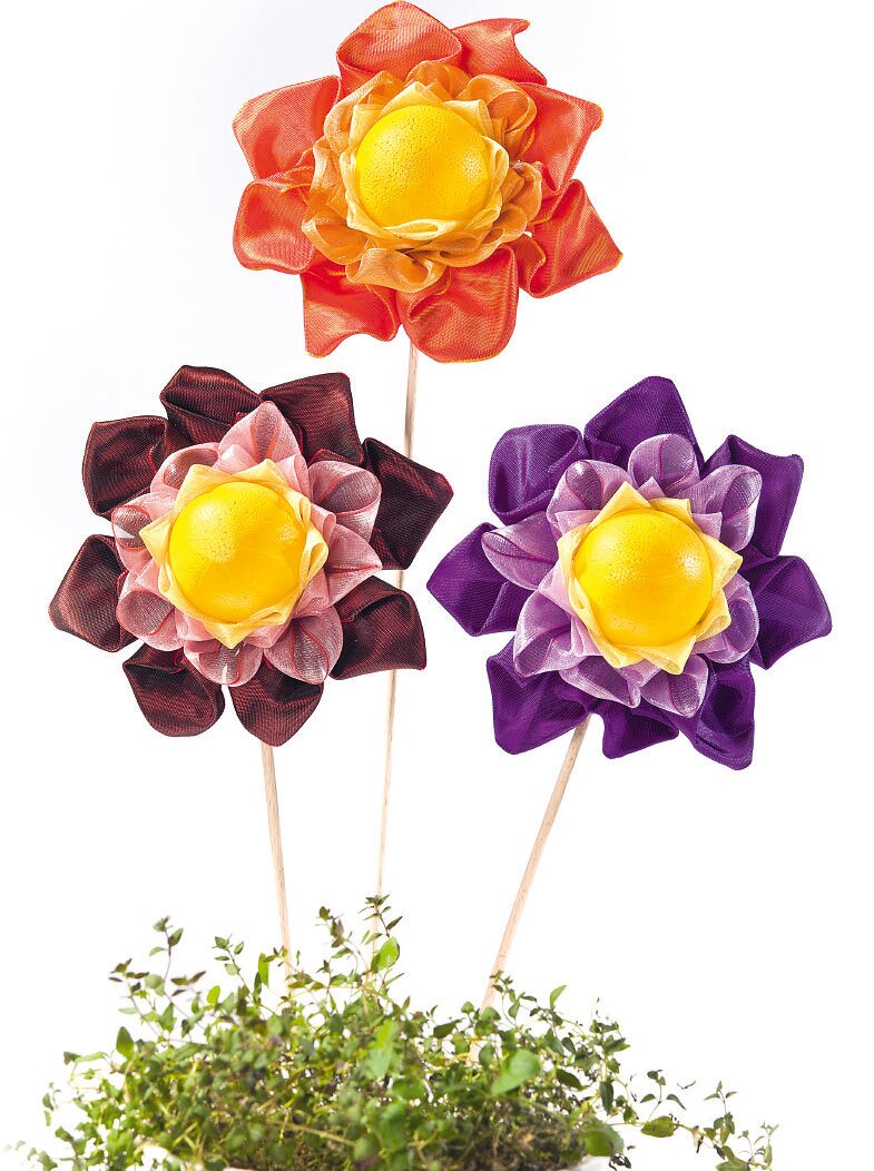For the flowers you need Acetate ribbon or Organza ribbon with Wire edge, Polystyrene balls, Handicraft paint, Pins, wooden skewers and brushes as well as scissors.