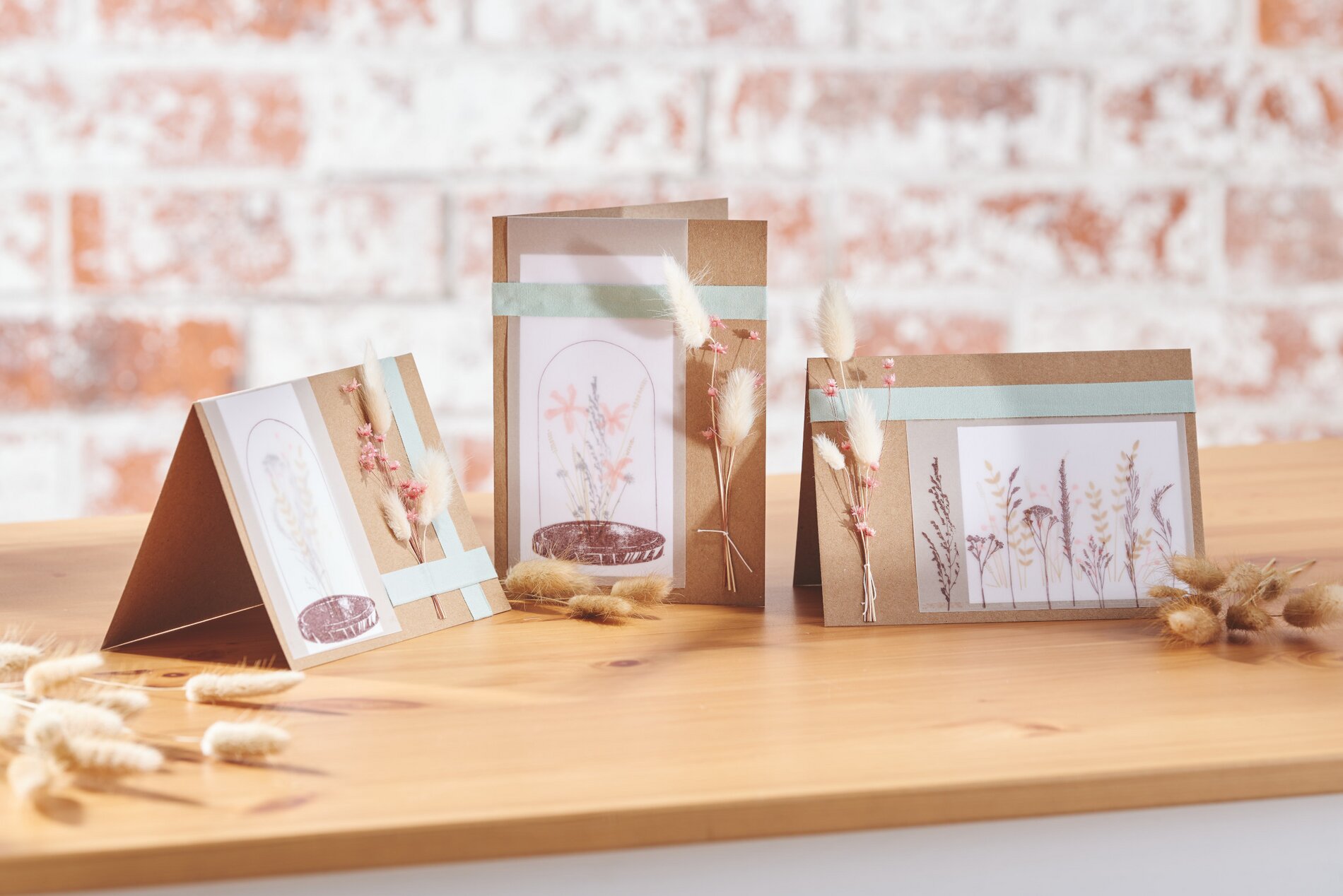 These greeting cards are designed with little effort. They are made with great stamp designs and with dried flowers on kraft paper greeting cards. With their natural look, they are a very special basis for your personal messages to friends and acquaintances.