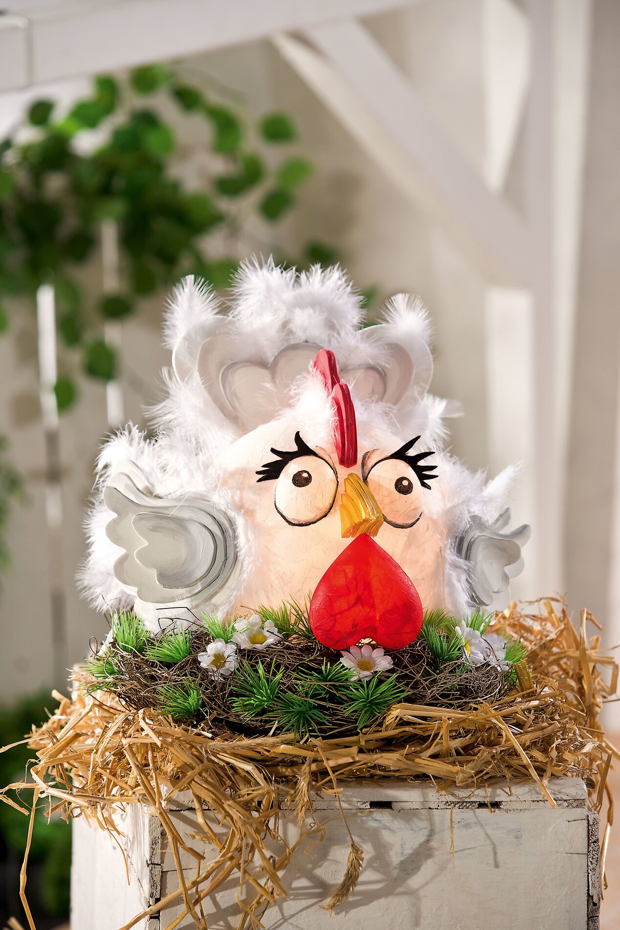 This chicken is a real looker! Henriette consists of different Acrylic forms, wings, tail and beak are Foam sheets joined together. The clou are the real Feathers, ones she is lavishly equipped with.