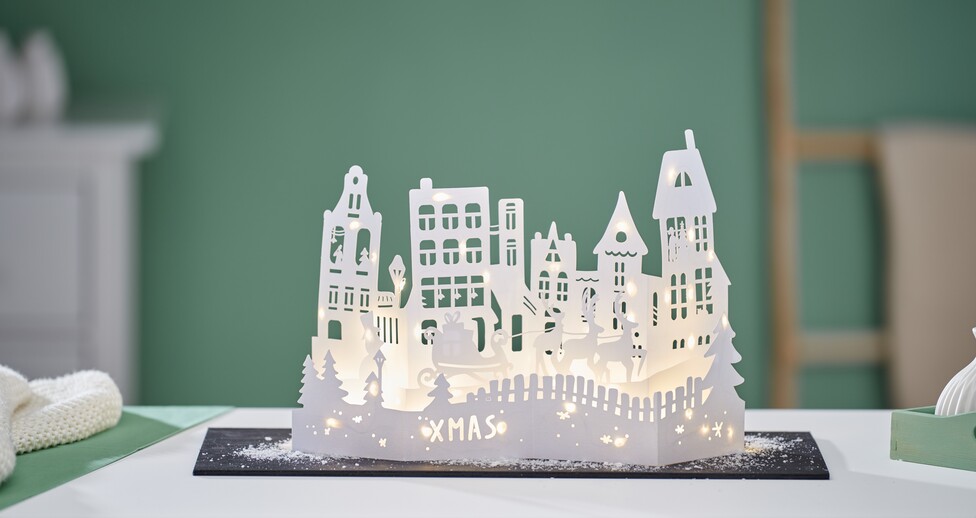 Unwrap the chain of light completely. Glue the first light after the battery compartment with hot glue. Then bend the wire with lights the way you want it. In between, fix the wire in place with hot glue. Make sure not to glue the chain of light on too tightly so that the silhouette can still stand up later. You also need to pay attention to the transitions between the silhouettes. Leave approx. 10 cm chain of light free so that you can bend the wire.