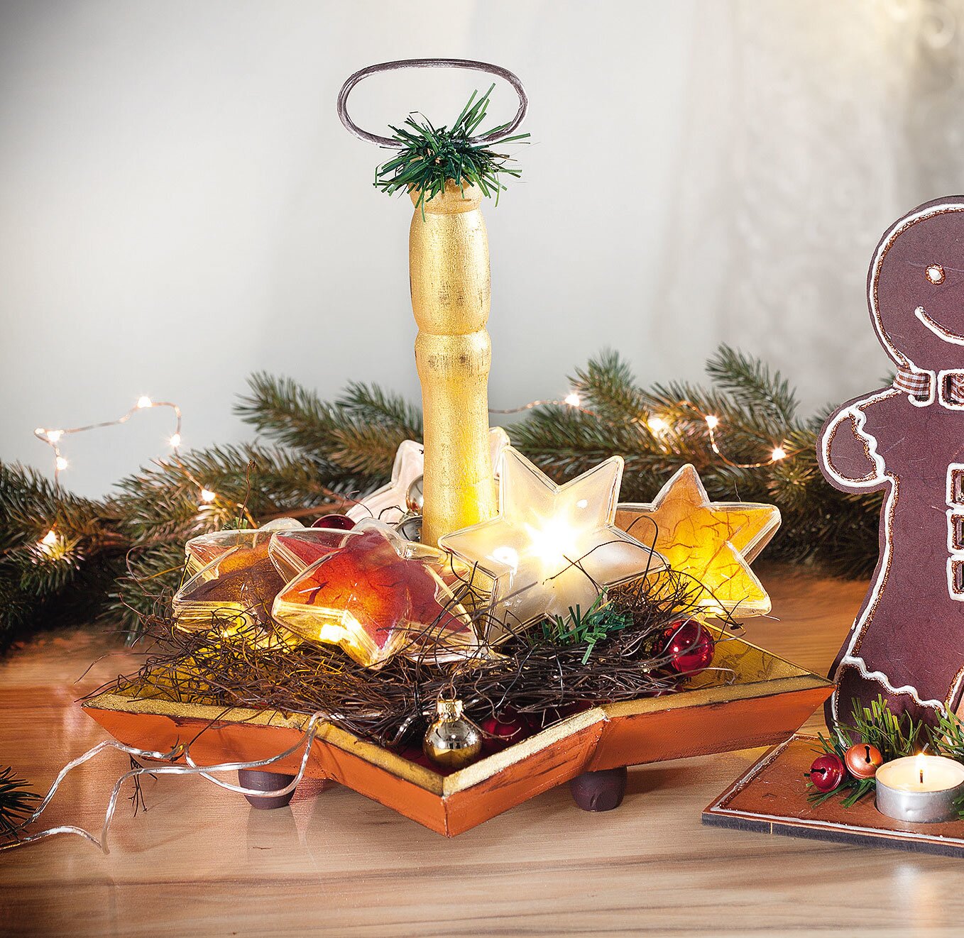 This tray offers you the ideal basis for lovingly designing it at Christmas time. The festive Gold and the classic baubles decorate the wreath with christmassy elements. A highlight is the chain of lights with the acrylic stars. It does not give only a cosy atmosphere but unfolds a very special secret when the lights are switched on: the stars of the foil integrated there become visible..