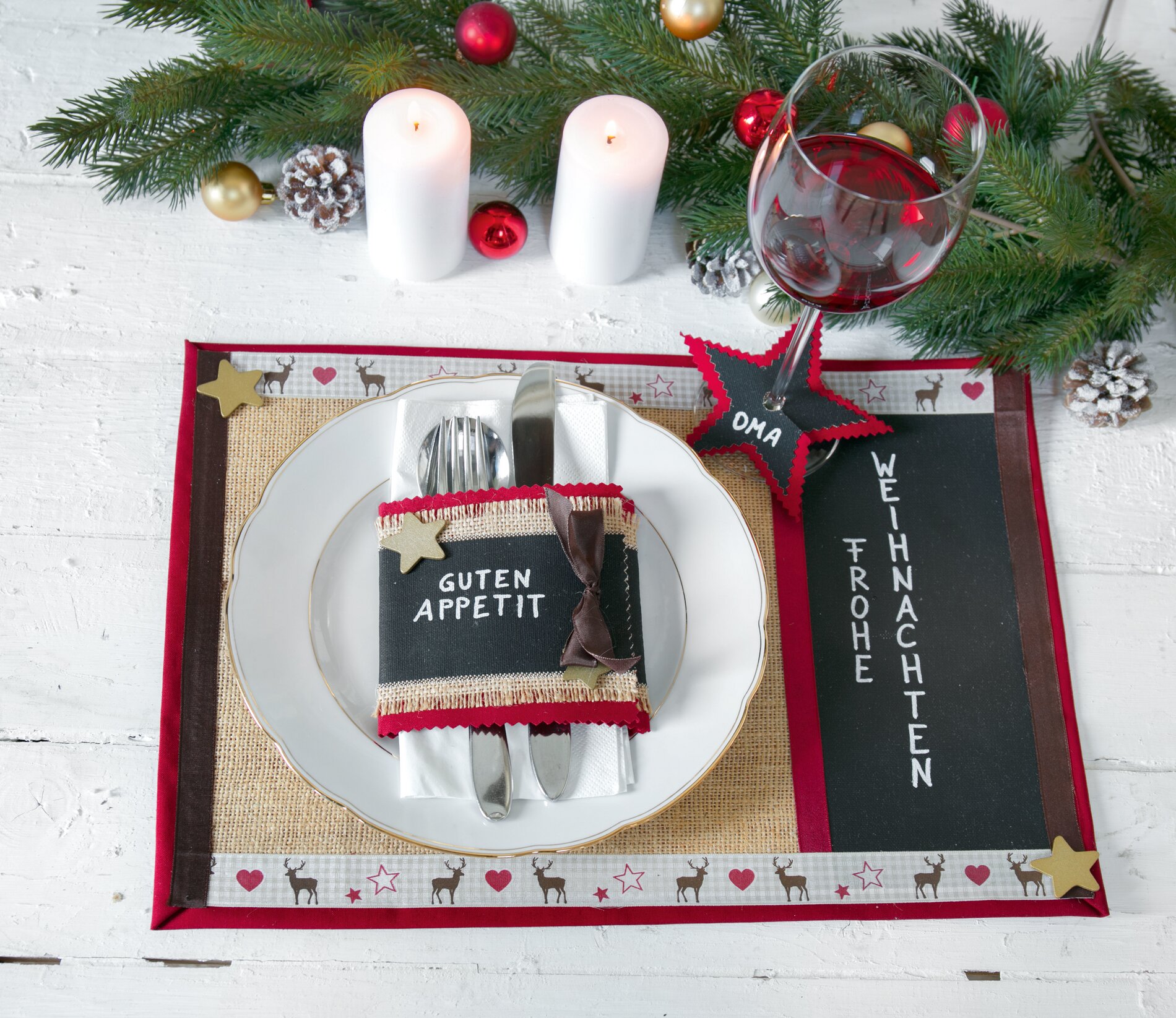 Cut the star of the glass rosette with the serrated scissors. Then connect red Cotton fabric and Chalkboard fabric with adhesive fleece, cut the opening for the wine glass with the punch pliers in the middle of the star and cut the star from hole in one place.