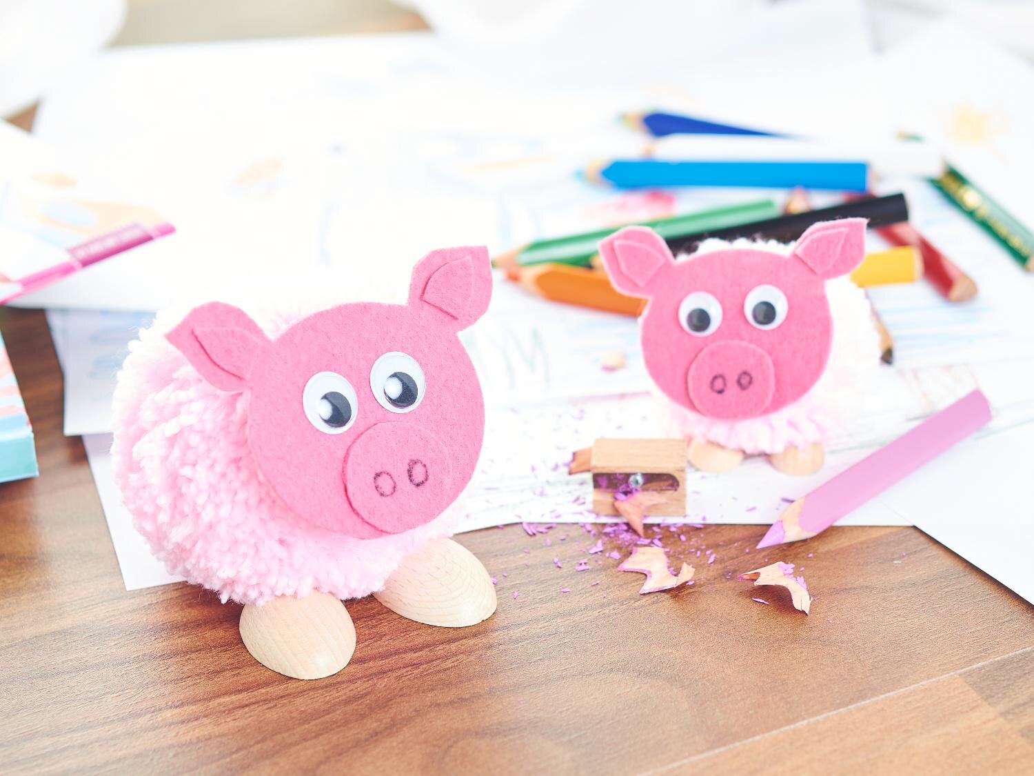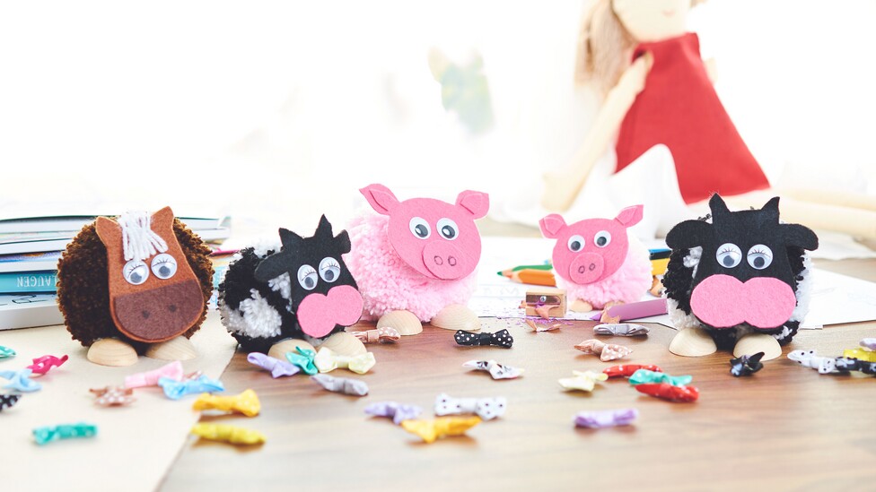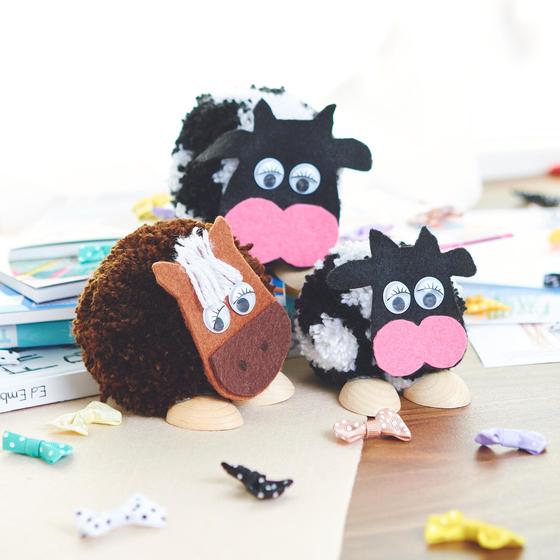 For one cow, you alternatel Stencily wrap black and white wool using the pompon . The little horses are made with brown wool, the pigs of course in Pink. To make the faces, first print out the motif template. Cut out paper templates, put them on Felt and cut out the individual shapes