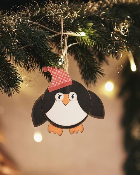 For the " tailcoat" a white circleis punched out and cut. Glue this onto a black circle. Cut out fins, beak, wings, cap and eyes. Paint the eyes with black Fineliners