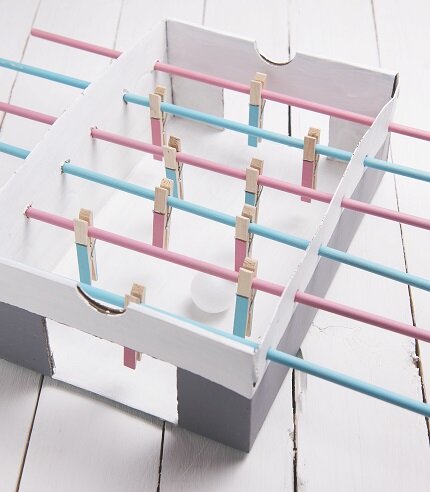 Then we drill the holes for the rods in the box. To do this, mark holes at equal intervals on the long sides of the carton. Make sure that the sticks are placed high enough so that the wooden staples do not touch the ground when playing. You can punch the holes in the box with a hole punch