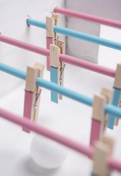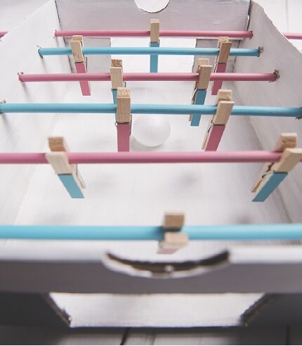 For our kicker we have painted 10 wooden clamps in two colours with a brush (5 clamps per team).
