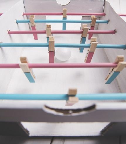 Finally, the rods are pushed through the holes and the wooden staples are attached. Then only is missing a Polystyrene ball or a table tennis ball as a kicker ball and you are ready to go!