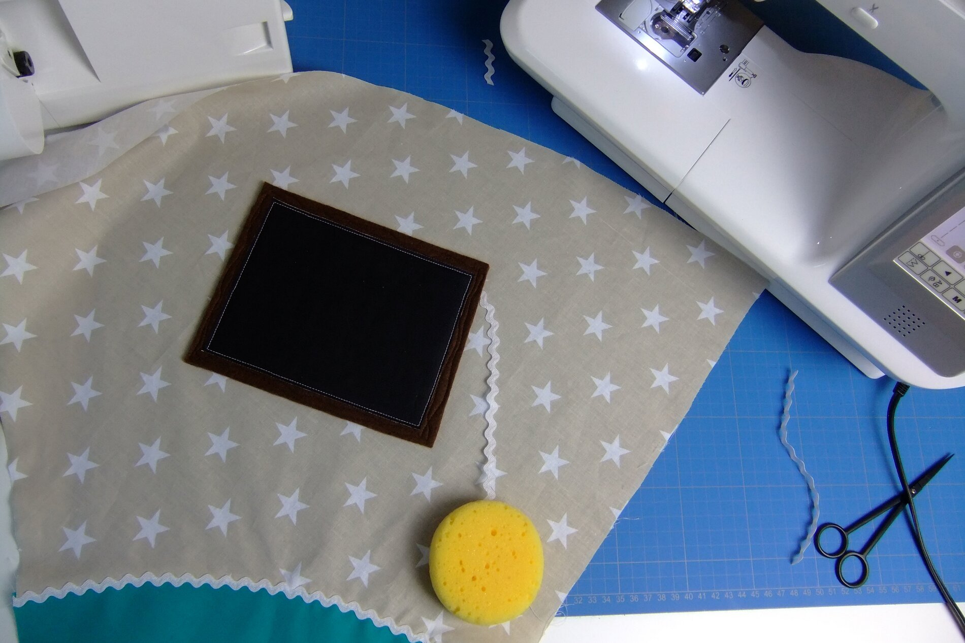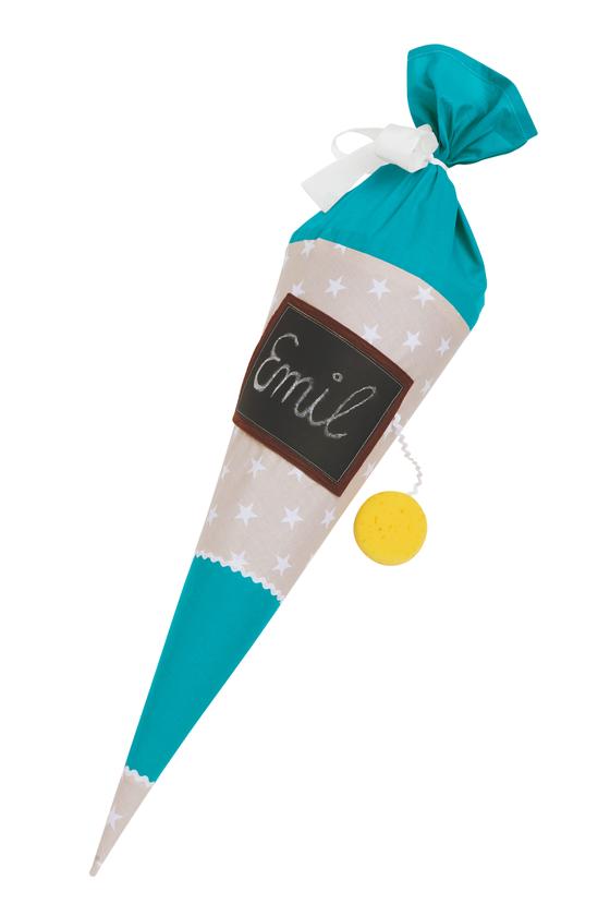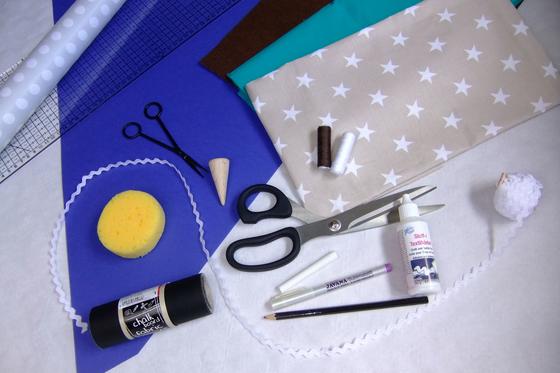 1 blank school cone, 1 wooden tip for the school cone, about 60 cm star fabric, about 68 cm plain Cotton fabric, 1 brown Felt sheet, some Chalkboard fabric, embroidered fabric or the motif to be applied, serrated tape and a sponge.