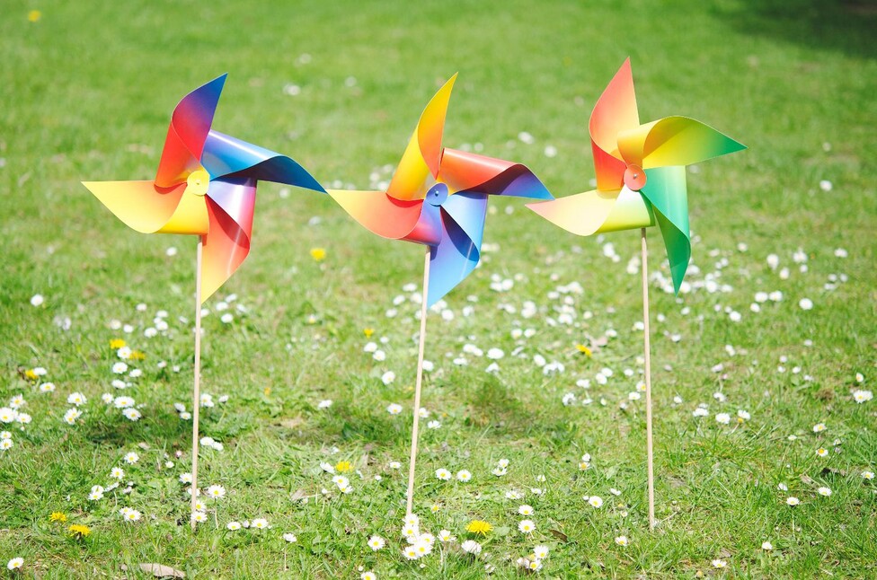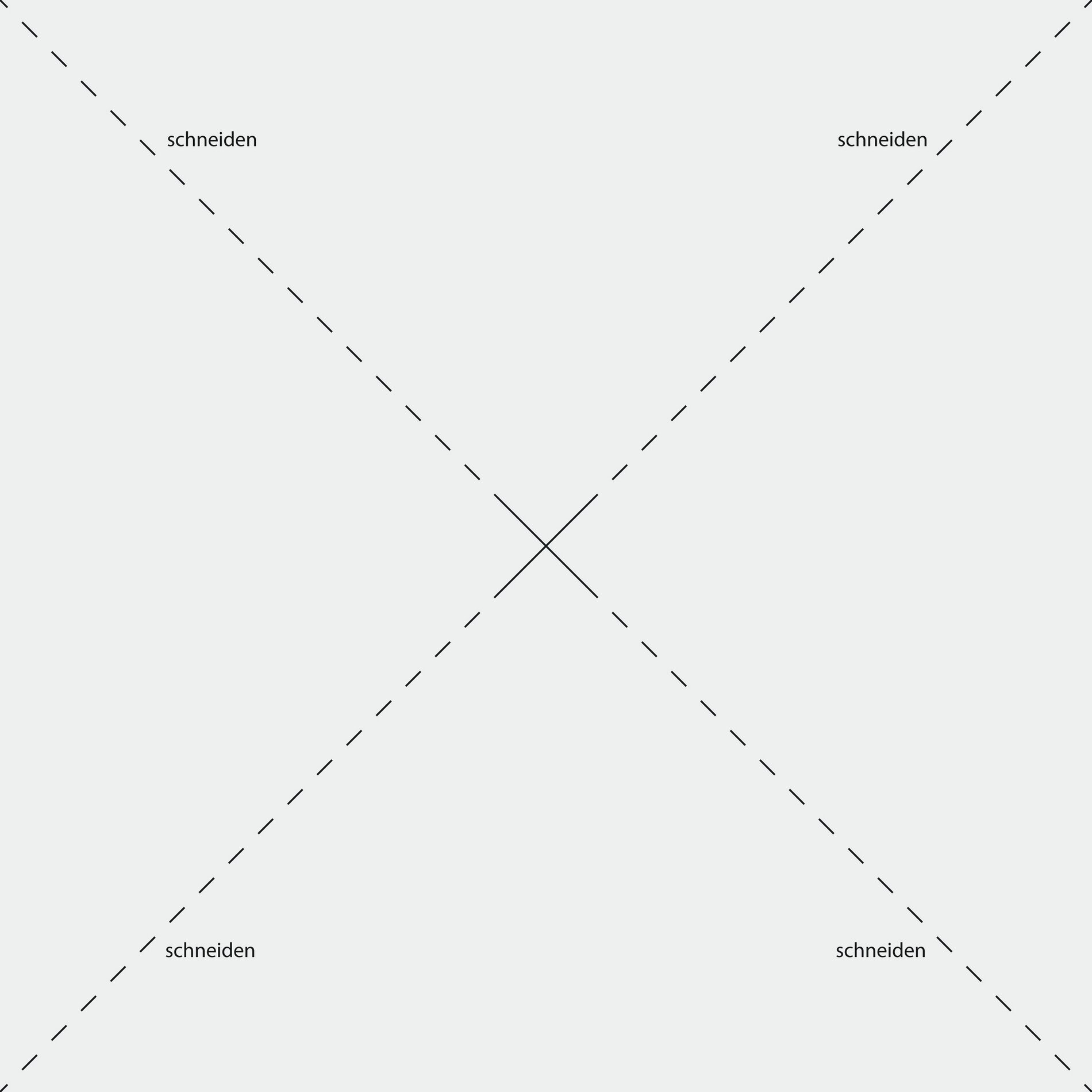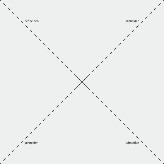 From Rainbow-Craft cardboard sheet, one square per wind turbine is cut out, 22 x 22 cm in size. Using a ruler, draw two lines across the square from corner to corner so that the centre of the paper is marked precisely. Using the lines drawn, cut Lace to within 2.5 cm of the centre.