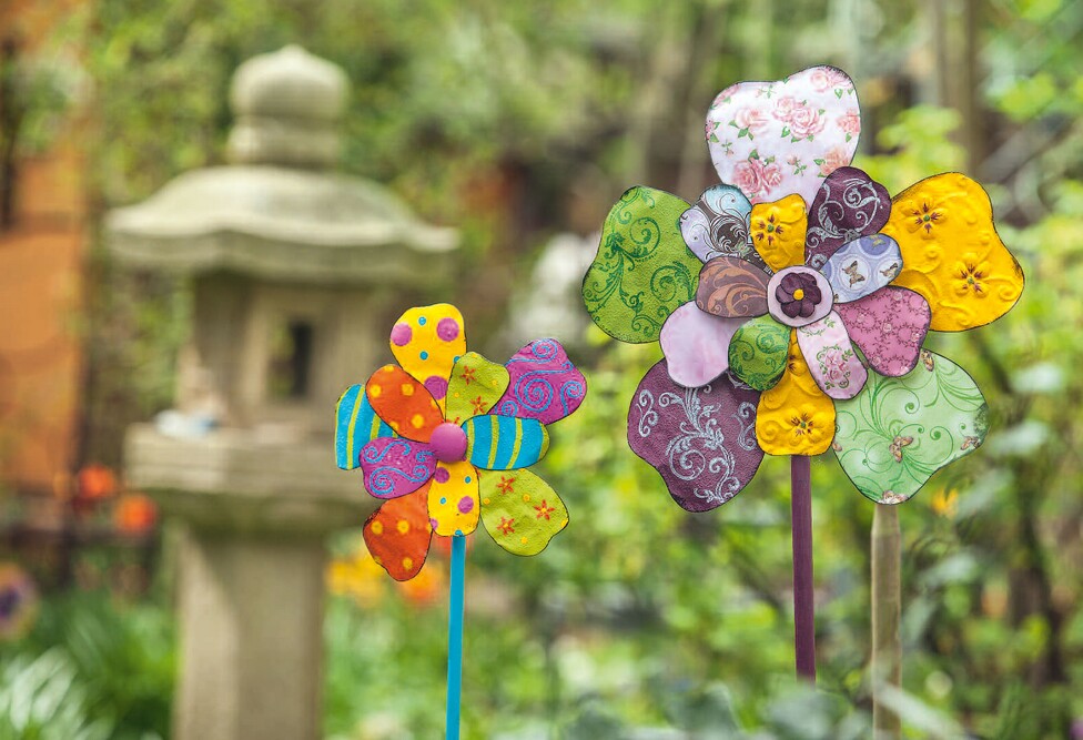 Stick scrapbook paper on some petals of the large flower as desired, paint others first and then stamp them with the curlicues Handicraft paint