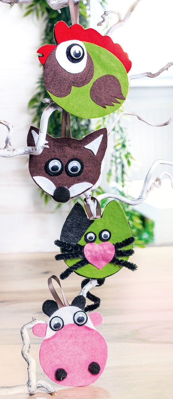 Put the outlines of the animals and the small elements on Felt sheets using the template. You need all cutouts twice for one animal. Prepare small hanging loops from e.g. Satin ribbon Glue this between the two outlines and decorate the animals with the Wobbly eyes, and moustaches on the front and back.