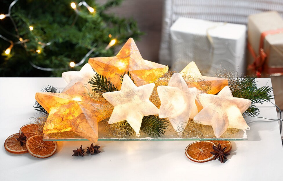 Use a scalpel to cut the opening of the hole free and thread the string of lights. Tip: Thread 2 lights in the big stars and one each in the small stars.
