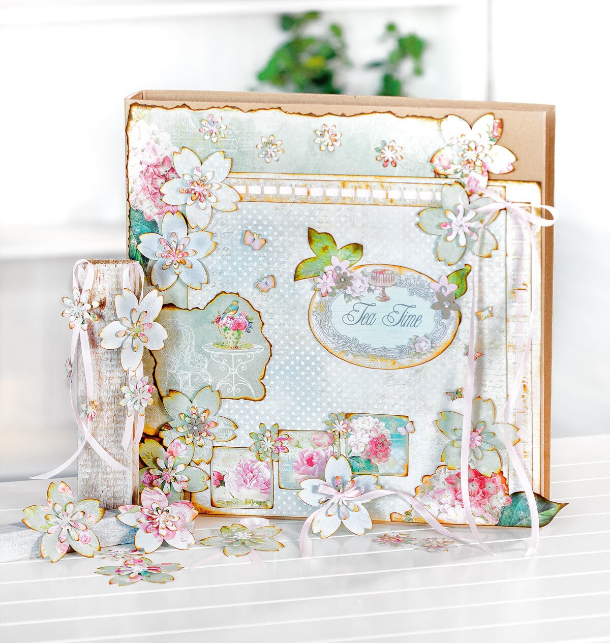 The butterflies and other motifs from the Paper punch out, cut or tear. Arrange all Paper-accessories decoratively on the cover and stick them on afterwards. Finally, stick on a satin zigzag border with tape-Ribbon and tie the ends into a bow.