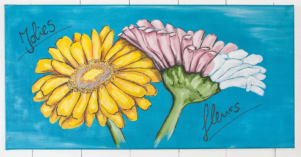 Paint the petals of the first gerbera with yellow artist-Acrylic paint:. By mixing light and dark Yellow in the still wet paint application with the brush, you get natural shades. The second blossom is painted half with pink paint, half with white paint. Again, work with shades. The