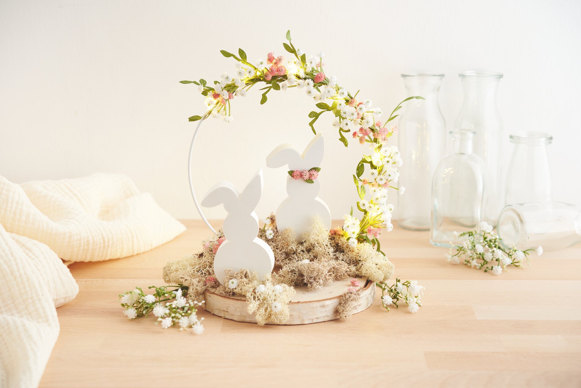 Glue a small wreath of flowers to one of the bunnies and attach both bunny castings firmly to the birch slice using hot glue. Finally, you can glue Iceland moss and a few more flowers to the birch slice to emphasize the natural look of the arrangement.