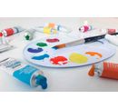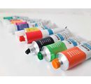 12 x 12 ml tubes in the colours white, Lemon Yellow, Orange, Vermillion, Violet Red, Coelin Blue, Ultramarine Blue, Light green, Sap green, Lights Ochre, Sienna burned and Black