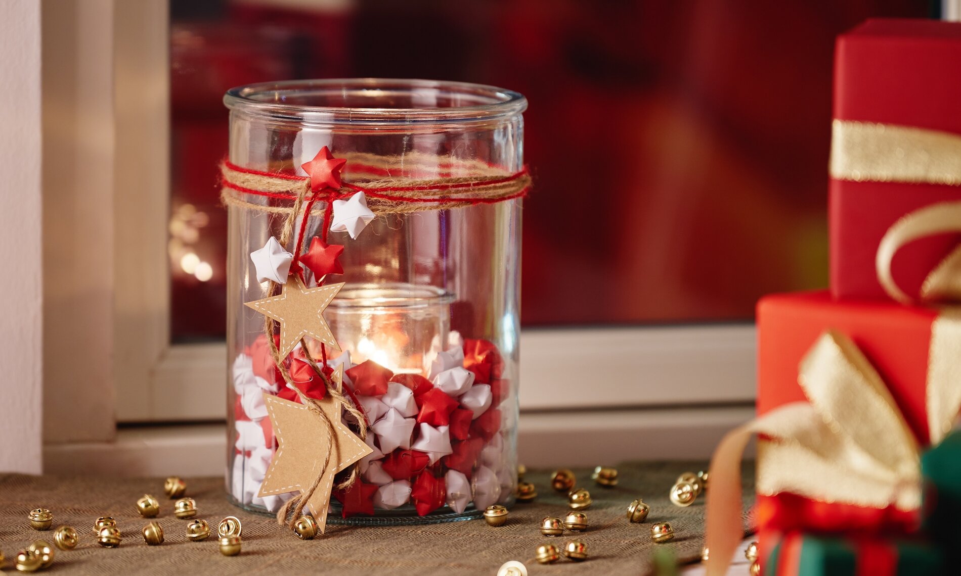 Then decorate the lantern glass with the different cords. You can also add a few individual stars and the pendants decorated with the Gelly Roll.