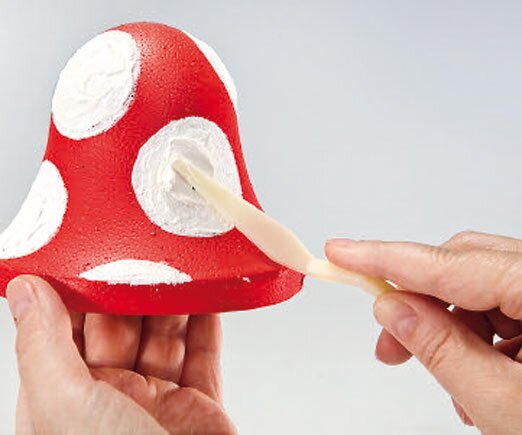 The polystyrene bells are primed with red paint on the outside and beige paint on the inside. Next, the white dots of the mushrooms are painted on the dried paint and after drying, they are painted with fine Structure Paste .