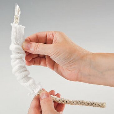 Figure wire is cut into pieces of unequal length. For the large mushrooms, glue two wires together with hot glue and pull the wide Knitted tube over them. For the small mushrooms it is sufficient to use a single wire which is pushed into the narrow Knitted tube