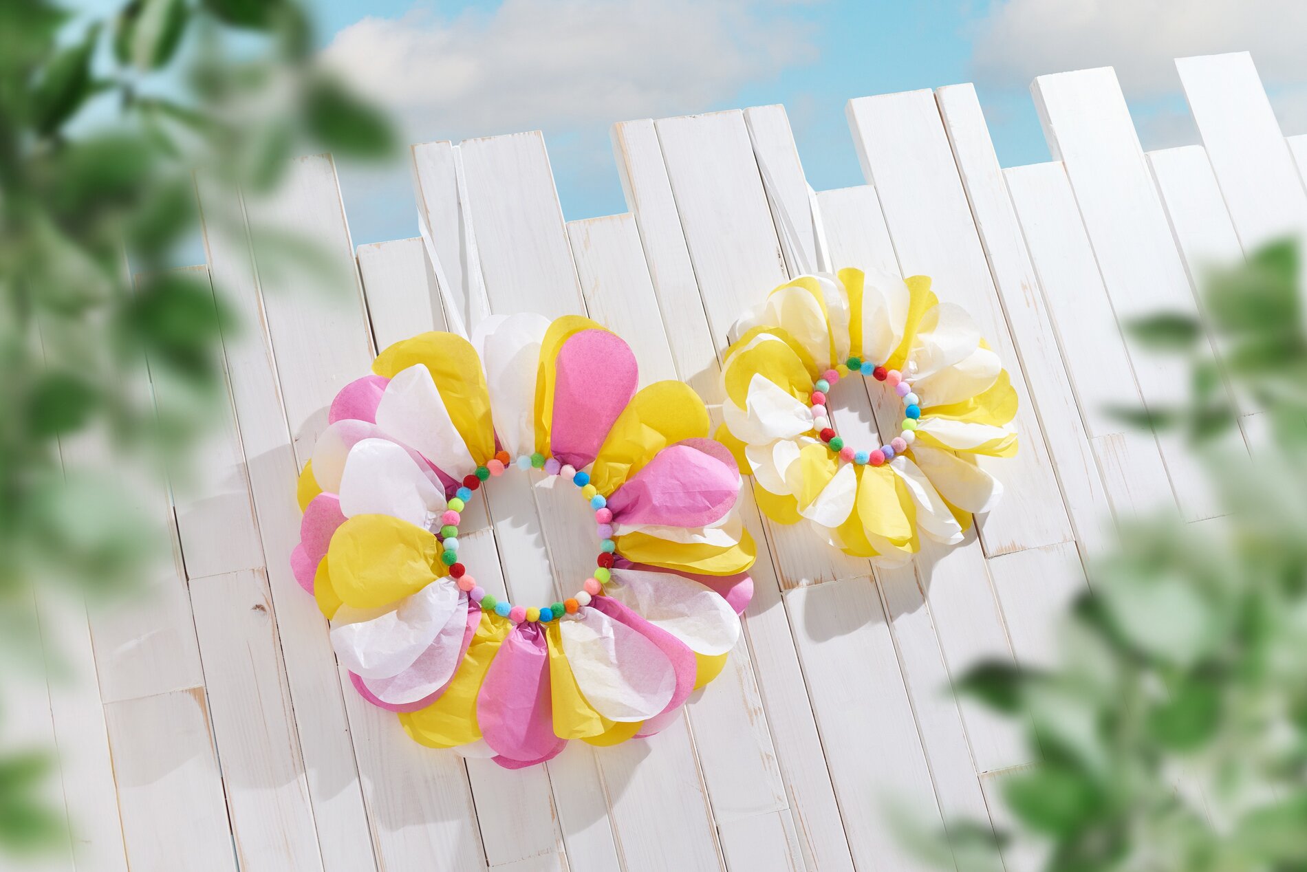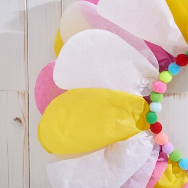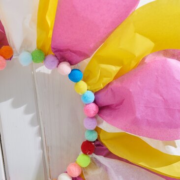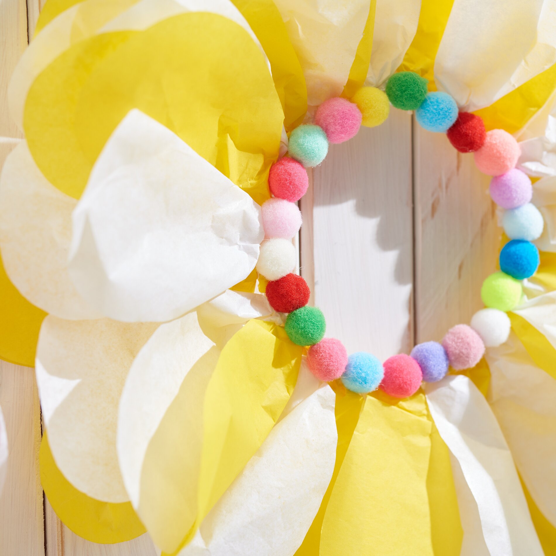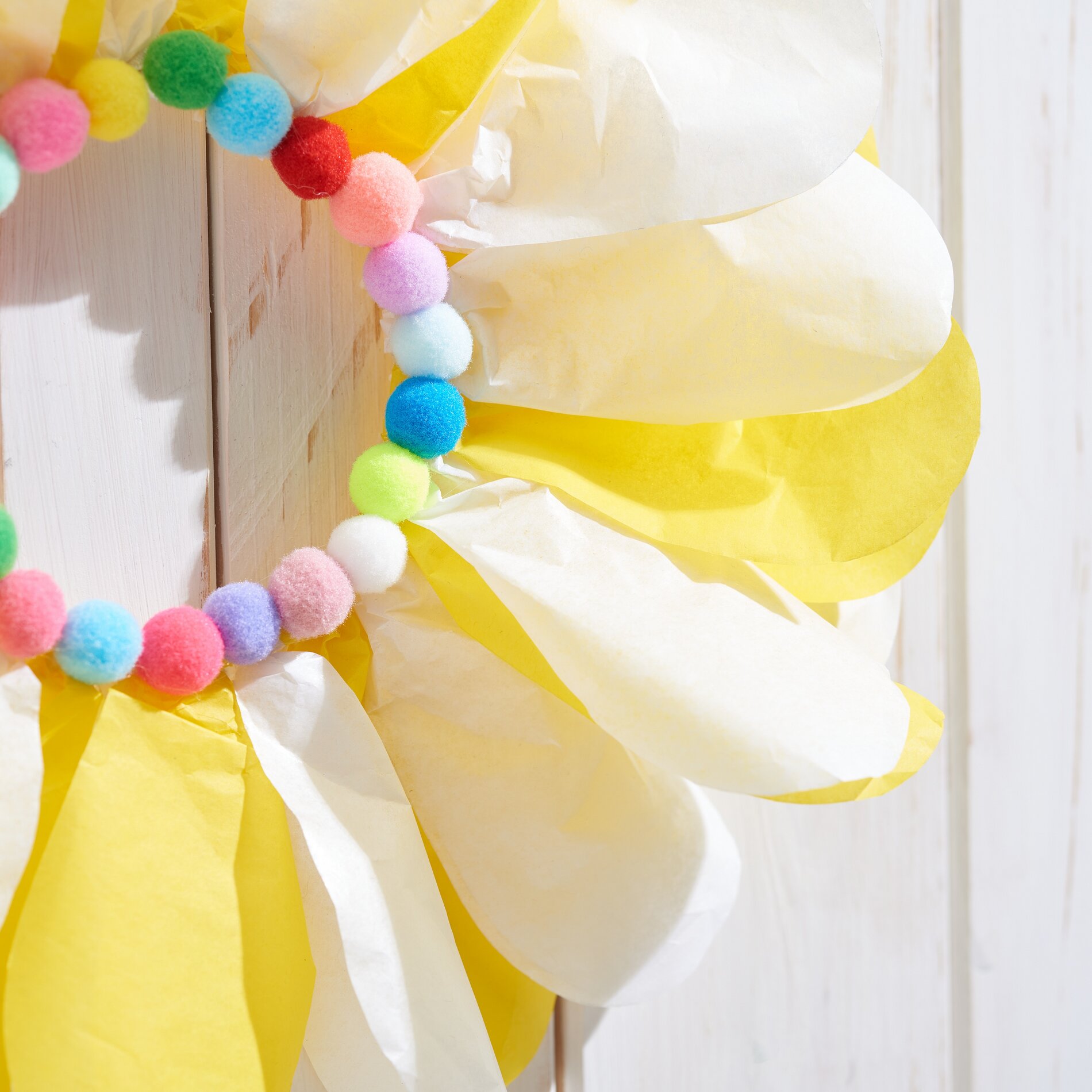 In the next step, glue colorful pompoms to the flowers on the ring. This makes the flowers look particularly colorful and also gives them a clean look.