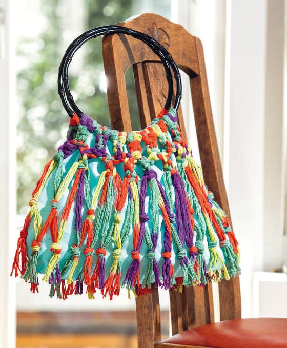 Take 14 threads in the middle and tie them with a loop to a Bag handle so that 28 threads of the same length are next to each other.
