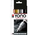 ... and the name says it all, because it is the only one you need to paint, write and design on almost any surface. The YONO has a high-quality Japanese bullet tip with a line width of 1.5- 3 mm. The colours are lightfast, brilliant and water-based. They dry matt and opaque. The Marabu YONO marker-Set "METALLIC" contains four marker in the following colours: Rosé-gold, gold, silver and black.