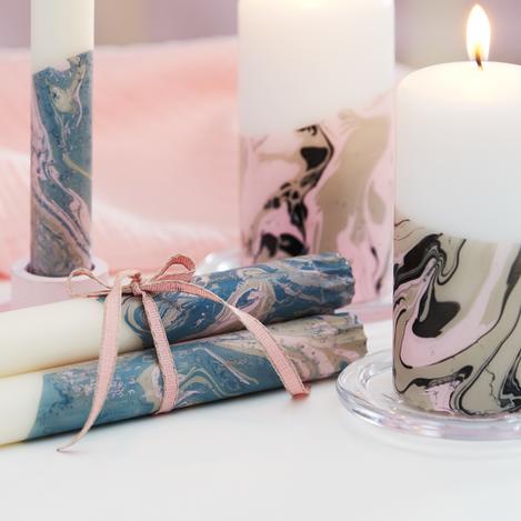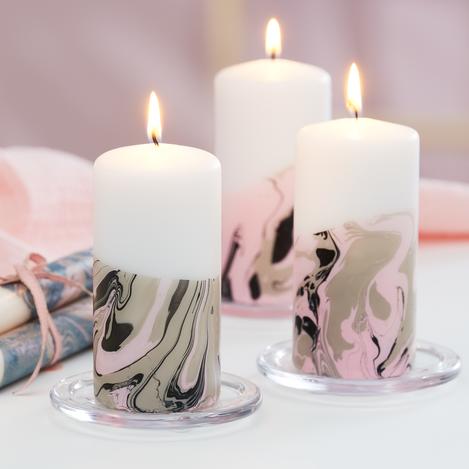 Candles with a marbling effect do not only look fascinating. They are also easy to make yourself. The marbling result is unique and individual every time.