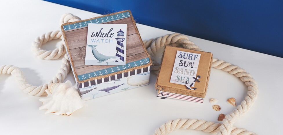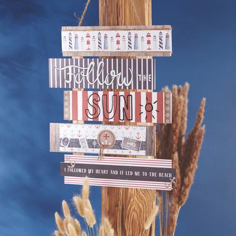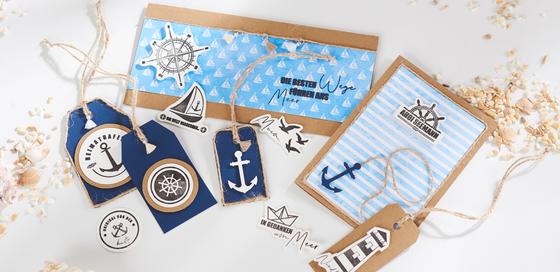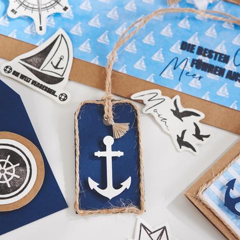The decoration examples in this idea are made with either nautical themed paper or natural kraft paper. In addition to the construction paper, place a cutting mat, ruler, cutter knife, double-sided tape, motif punch, stamp, stamp tool, stamp pad, hole punch and possible other accessories ready....